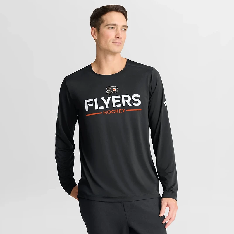 Sport the same gear as the Philadelphia Flyers with this Authentic Pro Rink Tech Long Sleeve T-Shirt by Fanatics It features smooth rubberizedteam details on solid fabric that provides a lightweight feel The droptail hem gives this Philadelphia Flyers tee a more comfortable fit all day