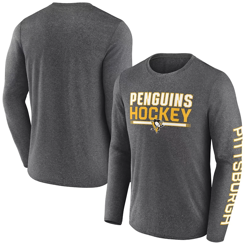 Embrace the thrill of victory with this Pittsburgh Penguins Sweep Iconic Synthetic Long Sleeve T-Shirt from Fanatics It features bold screen print graphics on the front and left sleeve ensuring your Pittsburgh Penguins fandom takes center stage Plus the heather color fabric adds a stylish touch to this comfortable and versatile tee