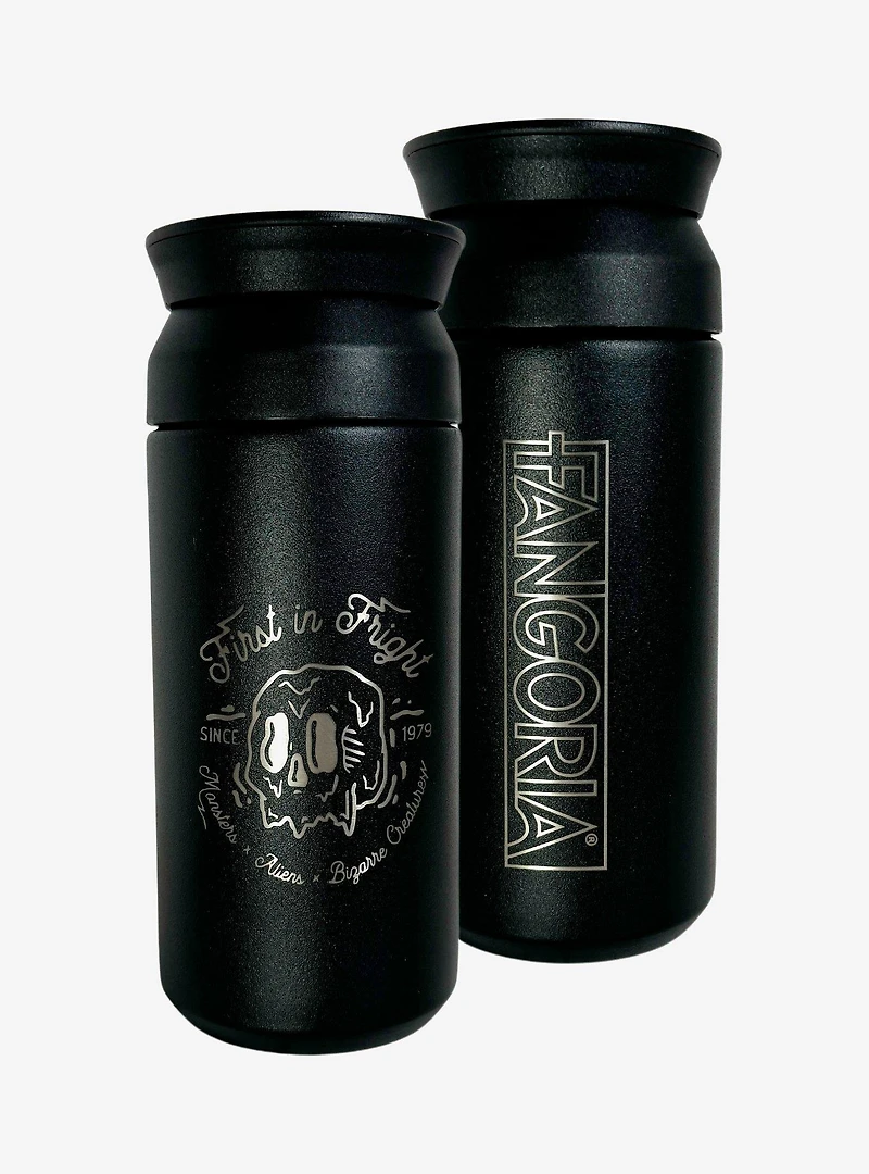 A cursed canister! A ruinous receptacle! This Fango tumbler is sure to warm your holiday spirits. Unscrew its ancient lid to store your most enchanted teas and harrowing hot coffees and cocoas. Its unholy magic extends the life of your drink, keeping it hot/cold for up to 6 hours! Comes in a witchy color scheme of black base/metallic silver design. Text reads: "First in Fright since 1979: Monsters + Aliens + Bizarre Creatures." MATERIALS: Double-walled stainless steel and BPA-free silicone. CARE & INSTRUCTIONS: Hand-wash with soap and warm water (do not microwave or put in dishwasher). Dry quickly to prevent rust. Do not keep carbonated beverages inside for too long, and clean well afterward. Item cannot be shipped to P.O. Boxes