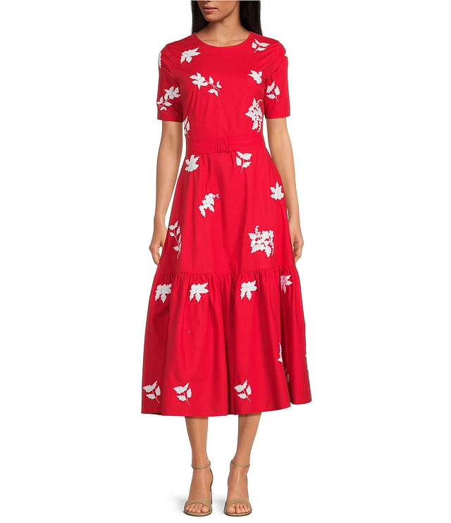 Maggy London Floral Embroidered Illusion Crew Neck Short Sleeve Ruffle Hem Midi Dress