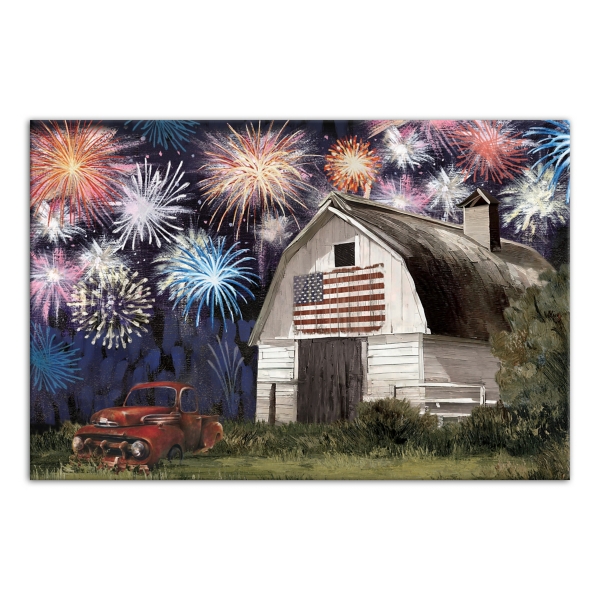 Make your walls pop with pride with our Farm Fireworks Canvas Art Print! This canvas features an array of fireworks over a barn and vintage truck. You'll love the rustic and festive look! Art measures 30L x 1.25W x 20H in. Distinctively printed on stretched canvas Wrapped edges complete the look Features a barn and fireworks Hues of blue, red, white, green, and black Weight: 3.06 lbs. Designed and printed in the United States Hangs from back-mounted hardware Care: Dust with a soft, dry cloth. This item is available at Kirklands.com only, not available in stores. Please note: this item cannot be shipped to APO/FPO addresses.