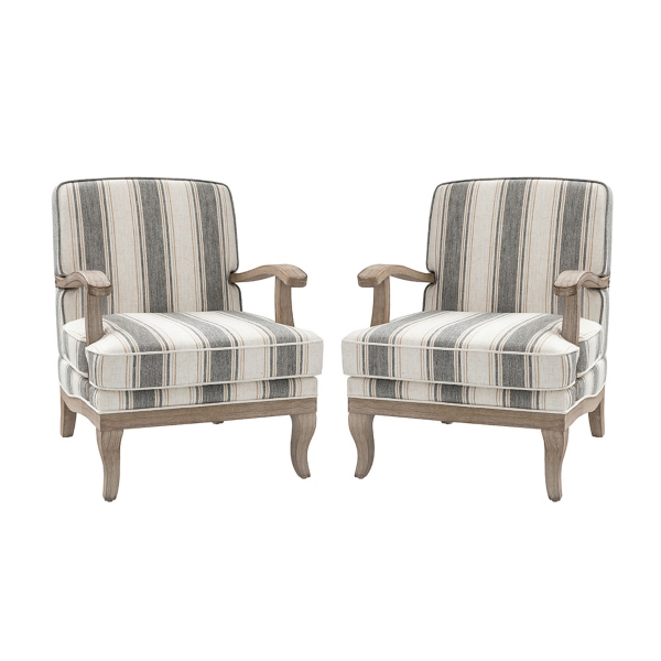Bring charm and comfort to your space with our Farmhouse Gray & Brown Striped Armchair Set! These handcrafted chairs feature high-strength spring support and thick, comfy cushions. You’ll love the farmhouse look these bring to your home! Set includes two (2) chairs Each chair measures 28L x 31.5W x 35H in.; seat height: 19 in. Crafted with a manufactured and solid wood frame Upholstered in durable fabric and filled with high-density foam Distressed leg finish Gray, ivory, and brown striped upholstery finish Features curved arms and legs Weight capacity: 250 lbs. Some assembly required Not intended for commercial use Care: Spot clean. This item is available at Kirklands.com only, not available in stores. Please note: this item cannot be shipped to APO/FPO addresses.