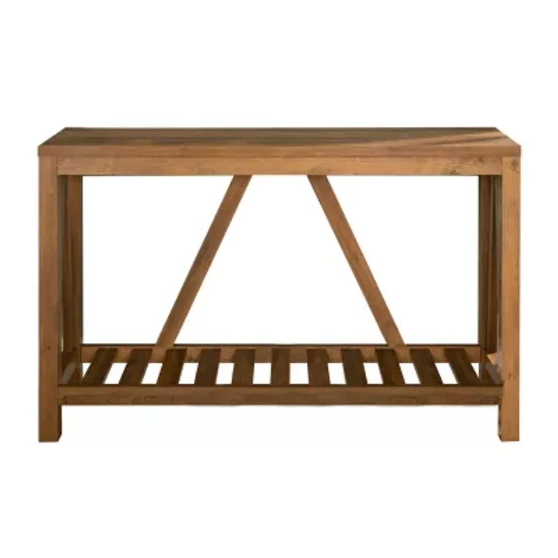 Rustic charm can be yours when you add this 52" A-Frame console table to your living room, entryway, or hallway. The marble and walnut two-tone finish bring the perfect touch of aesthetic appeal while the spacious tabletop and open slatted bottom shelf provide the perfect place to display and store your favorite accessories, photos, and collectibles. Constructed of high-grade MDF and durable laminate, this piece will be the simple answer for all of your decorating needs.