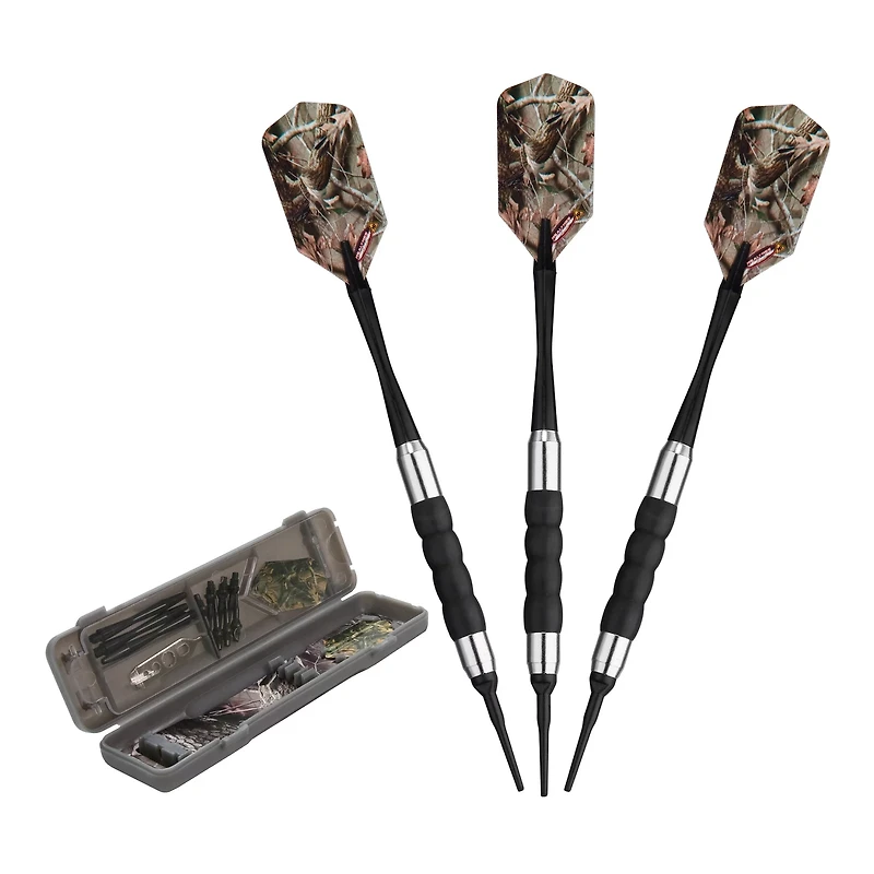 The Fat Cat Realtree Hardwoods HD® Darts Set includes darts with nickel barrels and nylon shafts for strength and rubberized Sure Grip sleeves for a sure hold. Camo-pattern flights. 2BA soft tips. Includes 2 sets of flights, extra tips, a dart wrench and a slim case.