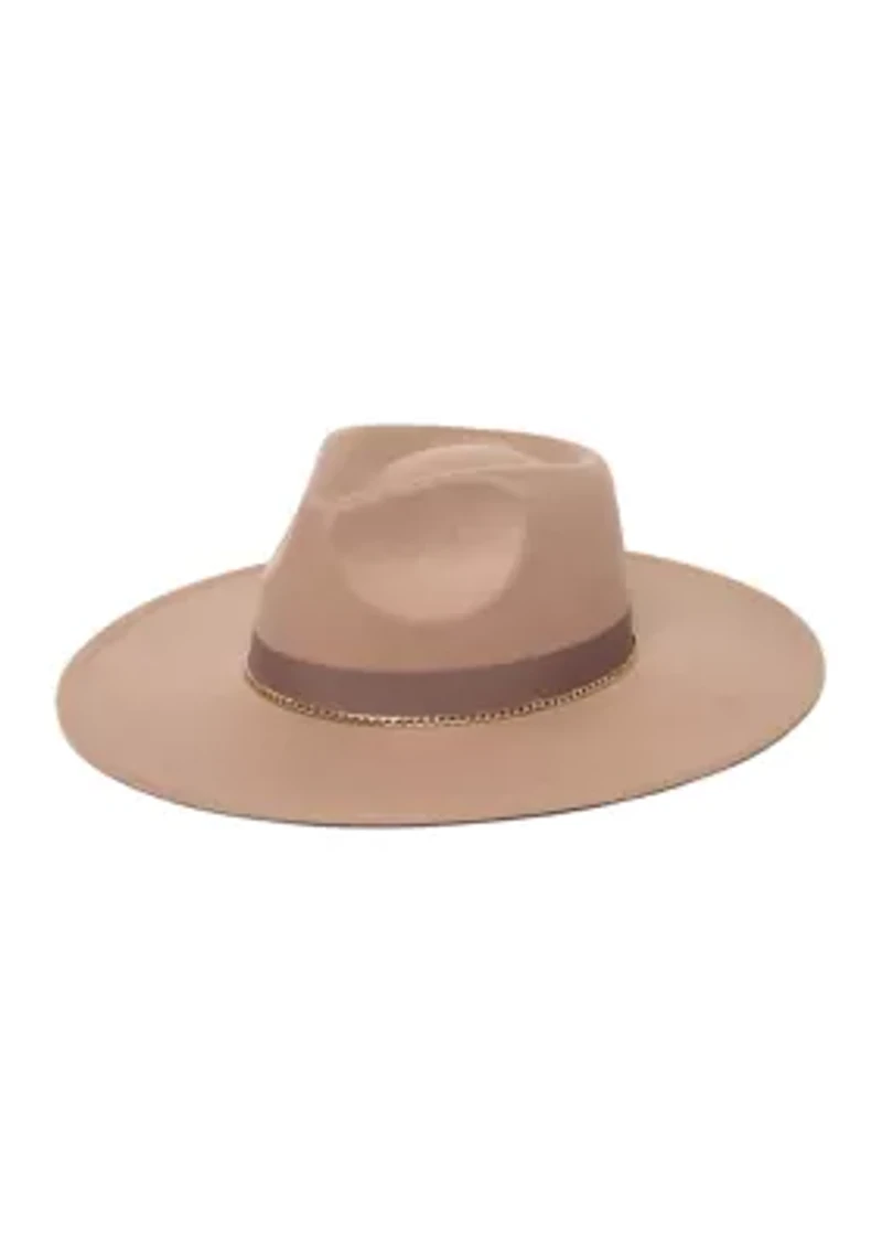 Faux Felt Fedora with Grosgrain Band and Gold Chain Trim