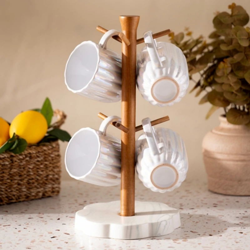Add a modern chic touch to your coffee station with our Faux Marble Scalloped Mug Holder. Including 6 hooks, this mug stand is perfect for showcasing your favorites! Holder measures 14.4H x 7.2 in. in diameter Crafted of acacia wood and stoneware Faux marble base finish Natural wood grain finish Includes six (6) hooks Care: Hand wash only. Contact your local Kirkland's store for availability. Quantities and selection may vary by location.
