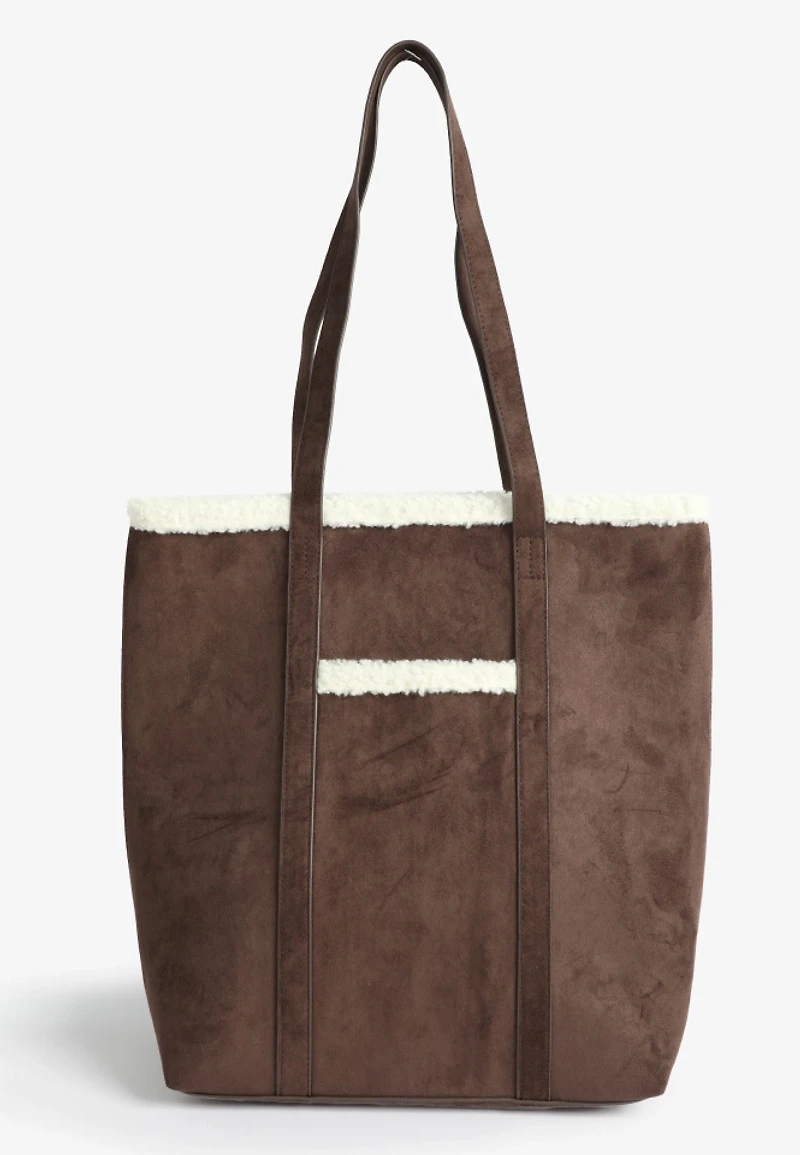 Faux Suede Sherpa Trim Tote Bag