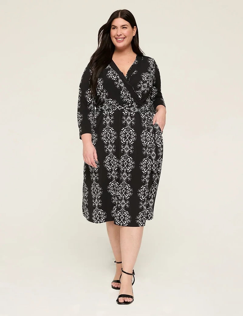 Available in Plus Size Ah, the (faux-)wrap dress. As universally flattering as it is chic, it delivers fit-perfect elevation every time. Especially when it comes in our fan-fave, so-soft Matte Jersey. FIT: Faux-Wrap. Surplice neck with a self-tie for a customizable, universally flattering fit. Front Length (On Body): 46" Midi length FEATURES: Surplice neck Long sleeves Self-tie belt with loops No closure, pull-over style FABRIC: Matte Jersey. Super soft & comfy, but also structured enough that you'll still feel pulled together at the end of your day. Machine Wash 95% Polyester/5% Spandex Item Number #410563 Imported Plus Size Dress ". Plus Size Faux-Wrap Jersey Dress, in Black Geo, 26/28, Women's, Lane Bryant