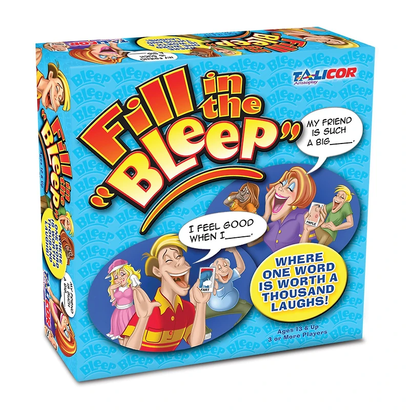 Fill in the Bleep is the single answer card game that creates a thousand laughs. Players are dealt BLEEP cards and are presented a sentence with a missing word. Players then fill in the blank with their best BLEEP card based on the die roll, (Funniest, Quirkiest, Choice). The dealer will then Fill in the BLEEP with the best submission. But beware of action cards that can change the game in an instant. Be the first to get rid of all of your BLEEP cards and you WIN! Fill in the BLEEP will bring brow raising, crazy, zany far out fun.Details:401 piecesFor 3+ playersFor ages 13 and upContents:280 Bleep cards100 Fill cards20 Action fill cards1 Die