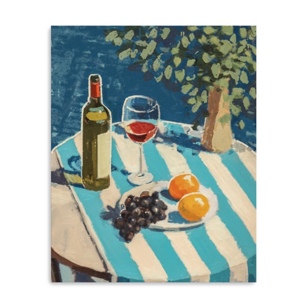 A plate of fresh fruit, a glass of wine, and beautiful greenery create the easygoing feel of this Fine Like Wine Canvas Art Print. This inviting scene might inspire you to take dinner outside. Overall dimensions Width: 16 in. Depth: 1.25 in. Height: 20 in. Giclee printed on stretched canvas Wrapped edges complete the look Features a food and dining table subject Hues of blue, green, white, and orange Artist: Aeious Plata Weight: 1.6 lbs. Hangs from back-mounted hardware Care: Dust with a soft, dry cloth. This item is available at Kirklands.com only, not available in stores. Please note: this item cannot be shipped to APO/FPO addresses.