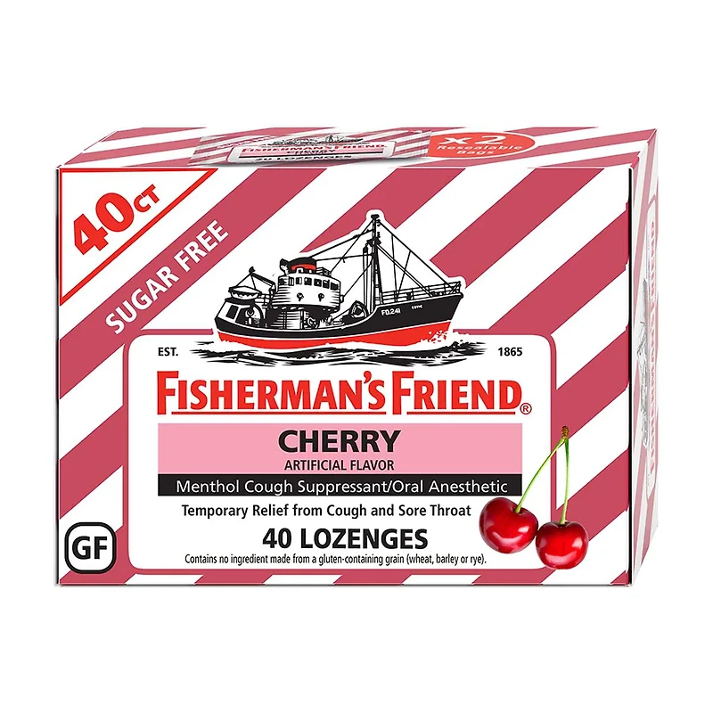 Soothe your throat and calm your cough with the strength of these Fisherman's Friend Cough Drops.. This vegan and gluten-free suppressant contains 6.9 mg of cooling menthol and a vibrant cherry flavor, which helps to temporarily relieve minor throat and bronchial irritation occurring due to common colds or inhaled irritants. They are convenient to consume and hassle-free to carry.