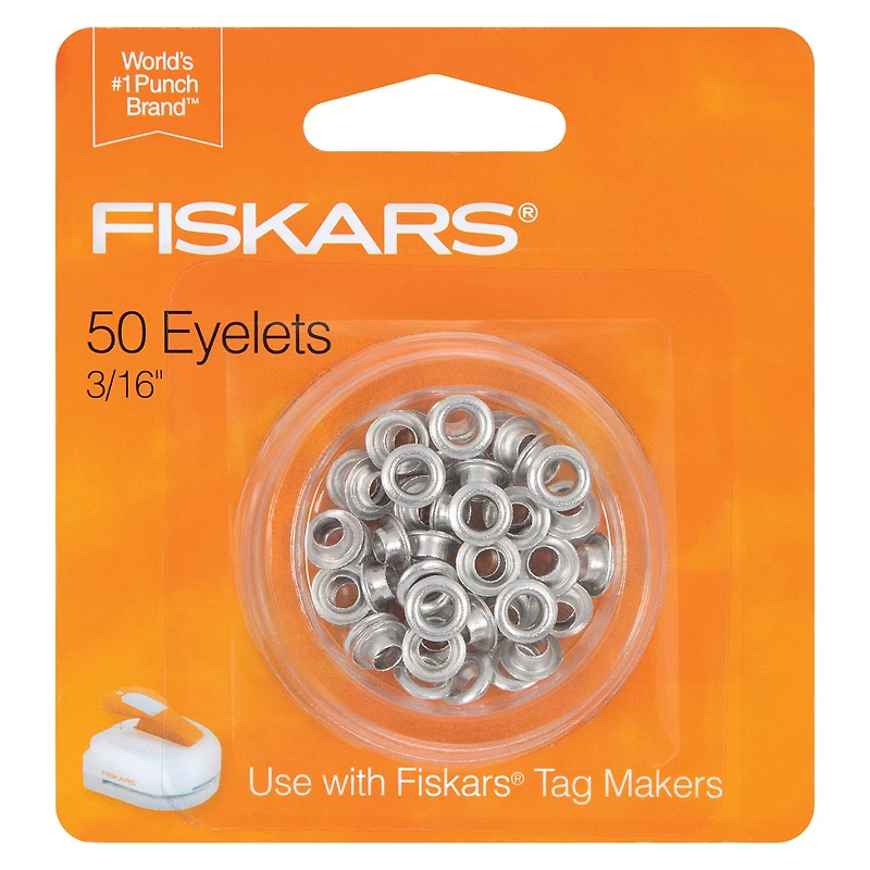 Bring home these silver eyelets from Fiskars and use them to add polished details to your price tags, label tags or gift tags. Along with giving the tags a better appearance, they are great to prevent ripping or damage to the material they are secured onto.Details:Silver colored3/16" diameter50 eyeletsMetalIdeal for use with Fiskars Tag Makers (sold separately)