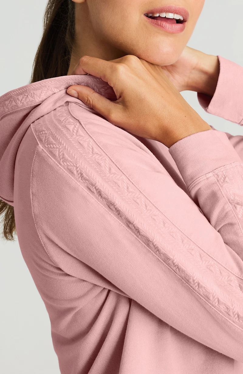 Our pullover is crafted from soft, breathable French terry with a garment-dyed wash that gives it a uniquely lived-in feel. Tonal embroidery at the hood and sleeves brings subtle, feminine detail. Style it with our Fit Embroidered Joggers for a complete look.