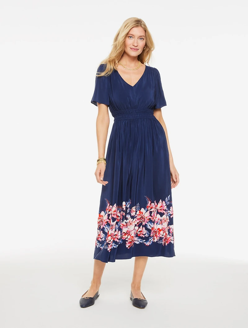 Our iconic fit & flare dress in a beautiful foliage border print. Crafted with a flattering V-neck and easy short sleeves. Versatile and endlessly flattering. A must-have for spring and summer.
