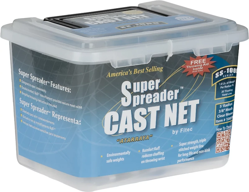 The Fitec SS-1000 Super Spreader™ 5' Cast Net features monofilament resin netting, heavy-duty 90 lb. braille test lines and a floating 26' braided polyethylene hand line. The Komfort Kuff™ helps reduce chafing on your throwing wrist. Bull's-eye design.