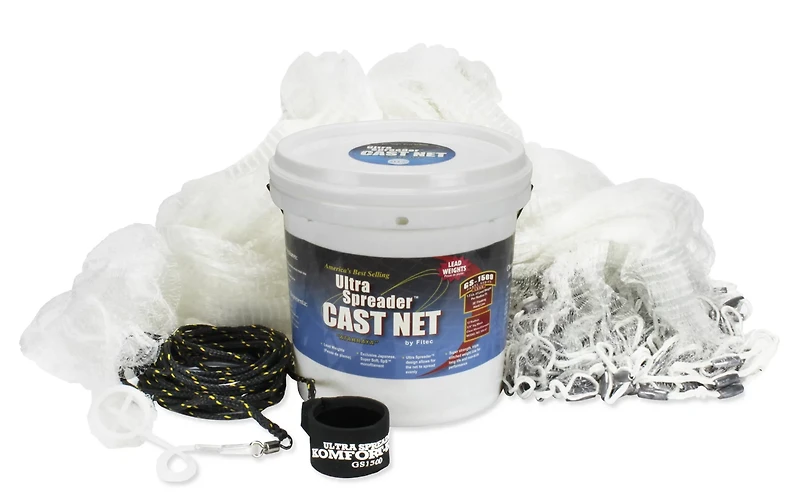 Scoop up your next catch with the Fitec Super Spreader GS1500 12' Mesh Cast Net. Made of monofilament resin netting, the net features a 6-panel design for great spread with less springback and 1.5 lb. of lead weights for fast sink rates and a secure bottom seal.