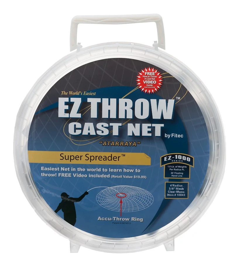 The Fitec Super Spreader™ EZ Throw™ 1000 Series 4' Monofilament Cast Net features a bull's-eye design with SPS Japanese 3/8" clear monofilament resin netting. Aluminum accuthrow ring helps displace centrifugal force evenly, enabling the net to open correctly. Instructional DVD included.