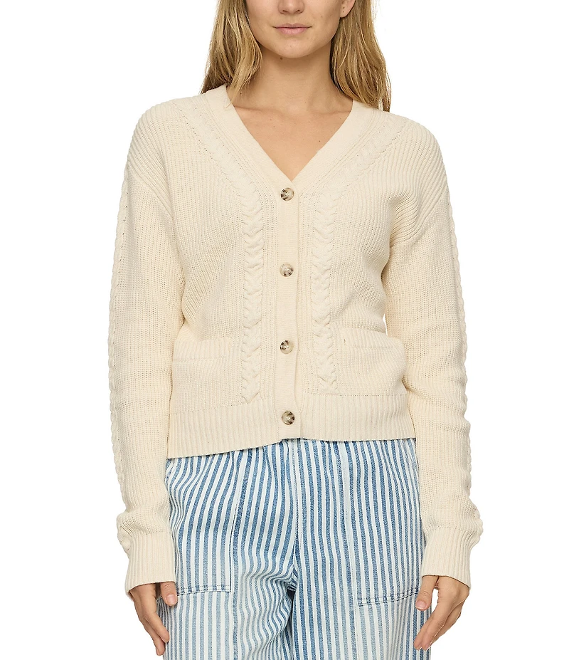 From Flag and Anthem, this cardigan features: Braided knit stitch details V-neckline Long sleeves Button-front closure Marbled buttons Front patch pockets Relaxed silhouette Ribbed hem Ultra-soft cotton knit Machine wash/tumble dry Imported.