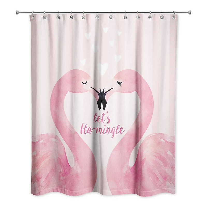 Add the perfect seasonal touch to your bathroom with this decorative shower curtain. This is a design you're sure to love this Valentine's Day season. Instantly update your bathroom with a stylish shower curtain that looks great and helps keep your floors dry.Details:Flamingo Mistletoe pattern71" x 74"100% softened polyesterStandard size with 12 stitch-enforced eyelets for hangingShower rod, rings, liner and grommets not includedBlank backMachine wash separately cold water, delicate cycle, do not bleach, tumble dry low, press with low heat
