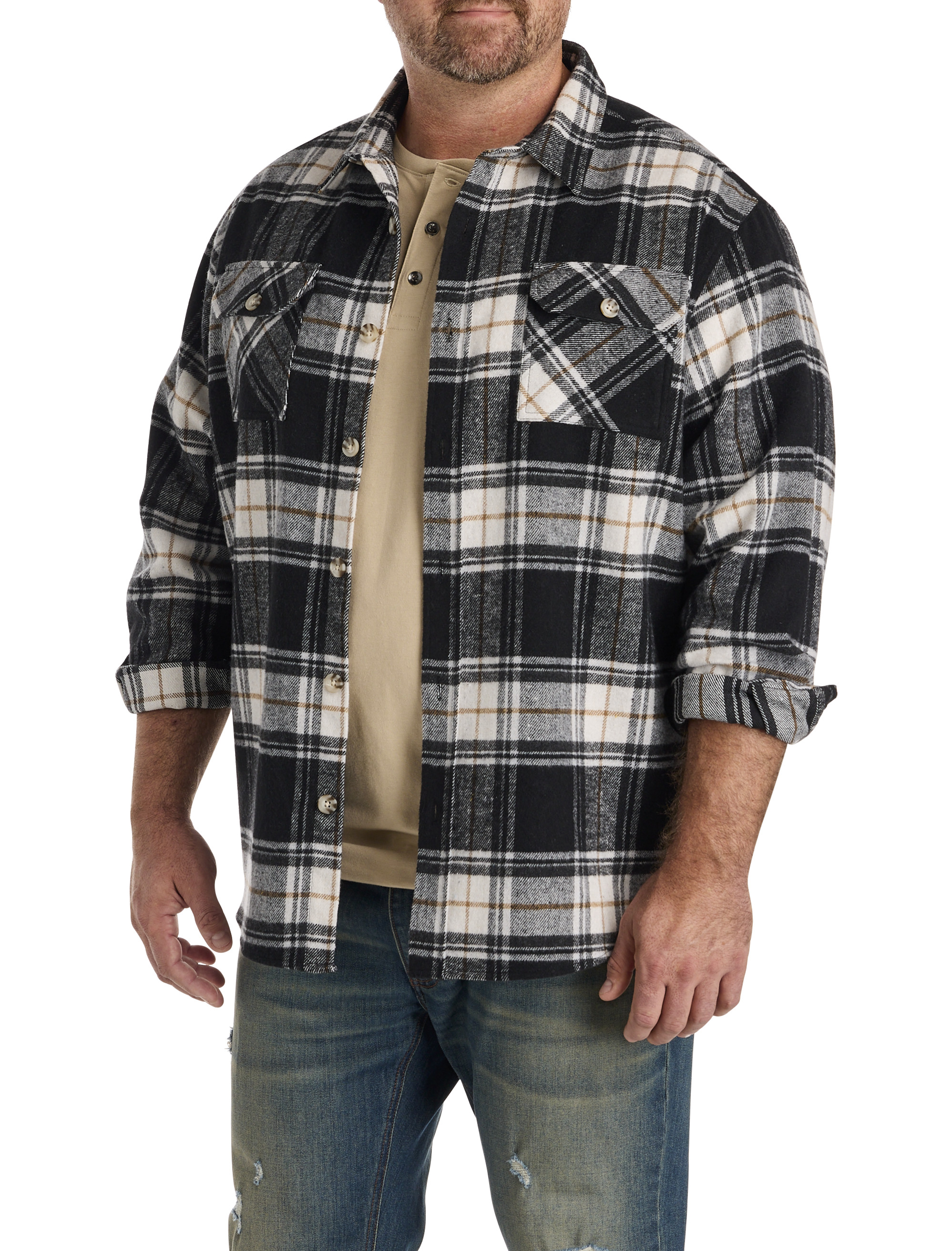Designed at DXL with precise proportions and the perfect Big and Tall fit, this True Nation button-down flannel shirt jacket is just right for the guy who doesn't 'do' coats. Durable and ultrasoft, it's crafted in a cozy polyester-wool blend that that keeps you warm without weighing you down and allows for the freedom to move without restriction. Cut to layer comfortably over a long-sleeve T-shirt, it's ideal for pairing with your favorite jeans.