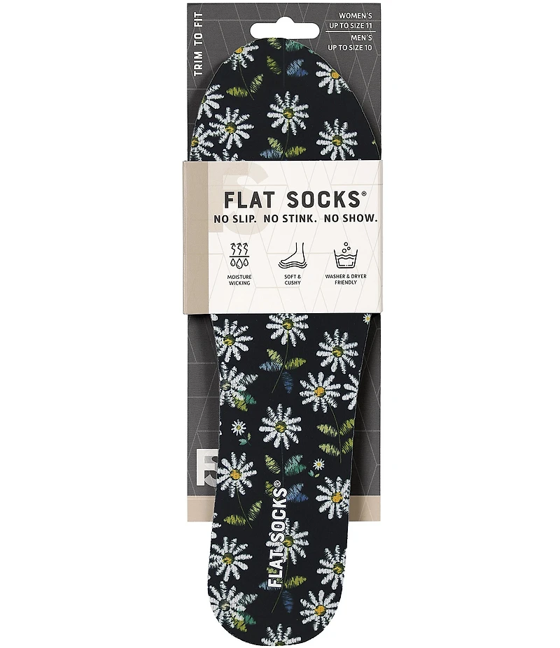 From Flat Socks, the Women's Mesh Daisy Floral Cushioned Liners feature: Odor-control tech helps keep feet fresh Moisture-wicking pulls sweat away Supportive foam makes every step comfy Fits up to women's size 11 100% polyester mesh 100% polyurethane foam base cushion Machine wash cold with like colors, no bleach/tumble dry Directions: If possible, remove current insole in shoe and use as a trim guide for Flat Socks. If you can’t remove shoe insole, use trim guides on the back of the Flat Socks to trim to the right size Imported.
