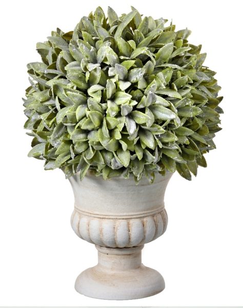 Give your decor a romantic touch with these Flocked Sage Ball in Urn Arrangements. Their urn bases add a classic touch that perfectly complements their flocked leaves. Set includes two (2) arrangements Each arrangement measures 11H in. Artificial potted sage arrangement Flocked sage orb Arranged in a fluted urn Urn features a weathered white finish Care: Dust with a soft, dry cloth. This item is available at Kirklands.com only, not available in stores. Please note: this item cannot be shipped to APO/FPO addresses.