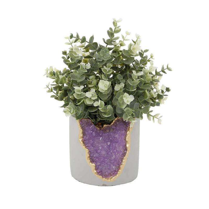 Place this green eucalyptus plant set in a cement amethyst crystal planter in your home or office to bring life to your space! This piece will add the perfect touch of color to any room! What's not to love?Details:Green plant in purple and gray planter7" x 7" x 10.75" overall piece size4.75" x 4.35" planter sizePlastic and cementRecommended for indoor use only