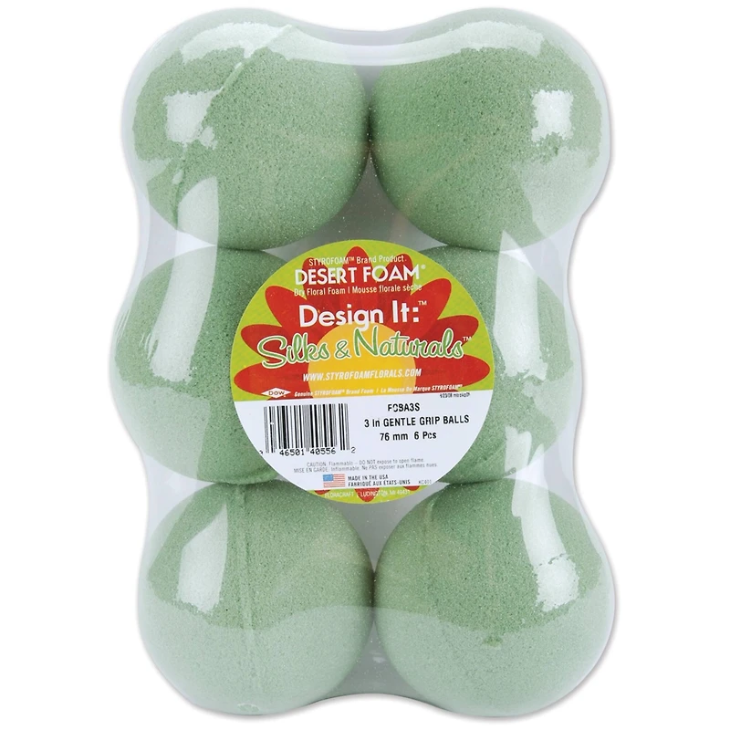 Create your next dried or silk floral arrangement with FloraCraft Desert DryFoM. Its soft cell structure is great for arranging fragile dried stems, delicate artificial flowers and wispy permanent botanicals. Made in the USA.Details:Green2.8"Contains 6 dry foam ballsCuts easily to fit any size containerBlends in with floral stems and moss for a natural lookGreat for beginner and professional florists alike
