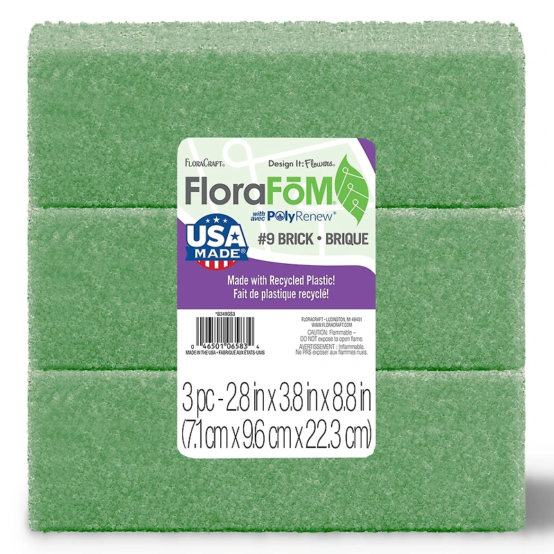 Start your floral displays and event decorations off with the right base by using FloraCraft FloraFōM green foam bricks—now made with recycled plastic! Its crunchy cell structure is great for holding artificial flower stems, heavy-stemmed naturals (like branches and twigs) and floral picks in place. It can also be cut, shaped, painted or textured to create any customized home or event décor.