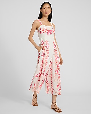 A breathable linen-blend jumpsuit complete with a square neckline, a floral print, and a wide leg cut.