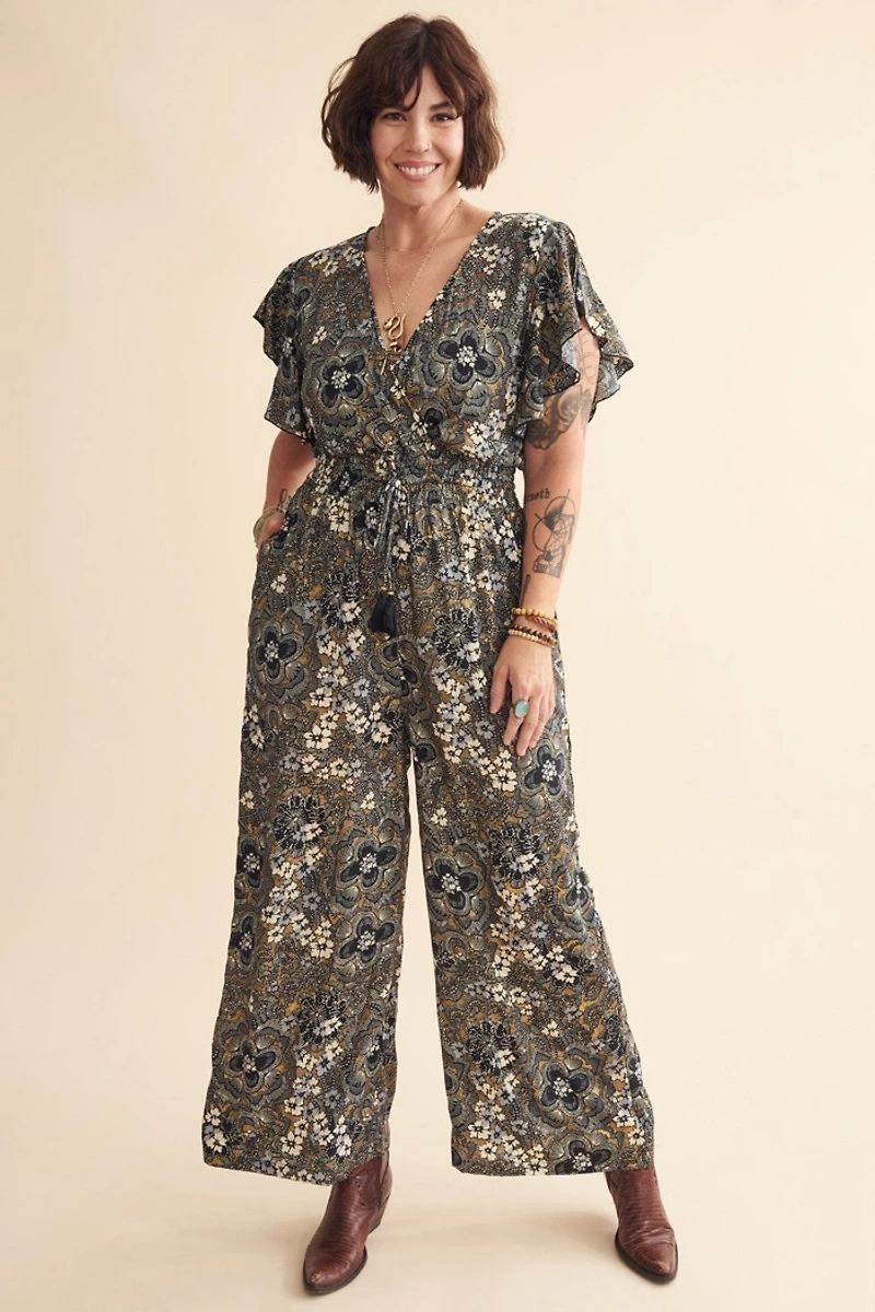 This sari jumper is a fresh update to a best-selling fave, reimagined with an even softer drape and elevated feminine details. Made in India from lightweight, silky sari fabric, this jumpsuit flows beautifully with every step and feels effortlessly polished from day to night. The rich navy base is layered with an allover floral pattern, subtly flecked with metallic gold for a touch of shimmer that catches the light without overpowering your look.Designed with flutter cap sleeves and a flattering V shape surplice bodice, it creates an easy, romantic silhouette that feels both comfortable and refined. The elastic wide stretchy waist offers all day ease, while the built in adjustable beaded tassel tie lets you cinch the fit just how you like it. A flowy straight leg design keeps the look relaxed and versatile, perfect for dressing up with boots or keeping it casual with sandals. Finished with a keyhole back closure for an added detail you will love, this sari jumpsuit blends graceful movement with wearable comfort.Whether you are heading to a special gathering, traveling, or simply elevating your everyday style, the affordable boho jumpsuit brings together artisan inspired beauty and modern ease. It is the kind of one and done outfit that feels special the moment you put it on and becomes a go to favorite just as quickly.