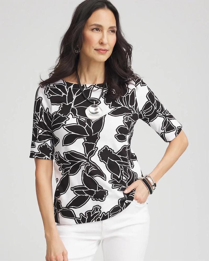 Take your tee look up a notch with our bestselling Pima Cotton Bateau-Neck Tee featuring a super flattering silhouette and the season's black floral print on an alabaster background. Offered in a luxuriously soft fabrication, featuring a perfect-fit boat neckline and short sleeves to elevate your casual styles with ease. Crafted in a comfortable yet polished pima cotton making it ideal for everyday wear.