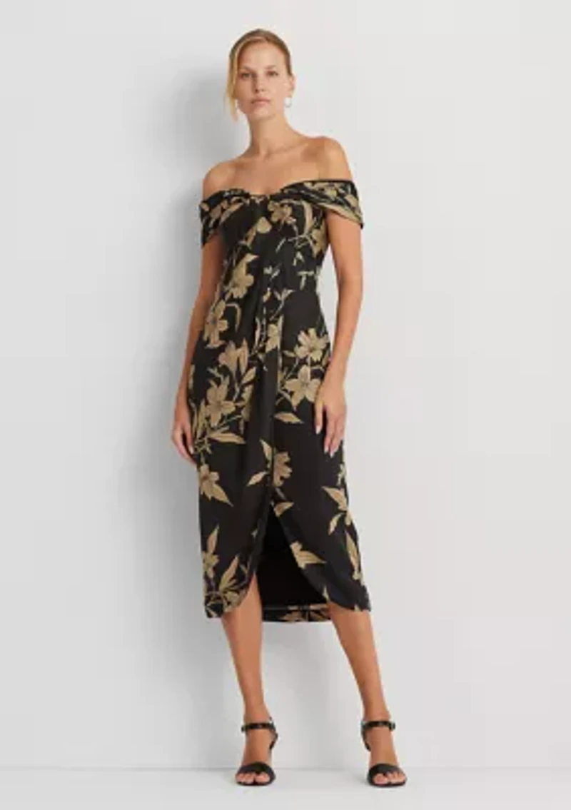 Modern refinement meets timeless glamour in this Lauren Ralph Lauren cocktail dress, which is designed with a tulip skirt, an empire waist, and a twist-front off-the-shoulder silhouette. Showcasing the season’s two-tone floral motif, it’s crafted with shantung for a fluid drape. Sheath silhouette Intended to hit at the mid-calf Size 8 has a 40.25" body length Dress length is taken from the center back and changes 0.25" between sizes Off-the-shoulder silhouette Sweetheart neckline Concealed center back zipper with a hook-and-eye closure Short sleeves Twist-front accent at the bust Pleats at the front left side Back waist darts Tulip hem Fully lined Model is 5'10" (178 cm) and wears a size 4 Imported Material & Care Viscose, linen Machine washable