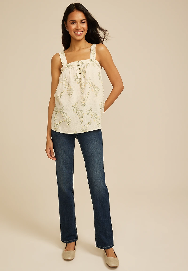 This square neck tank brings an easy, sun‑washed feel to everyday dressing, pairing a soft cream backdrop with a delicate leaf print that feels light and natural. The clean square neckline and button front add subtle structure, while the gently gathered body and smocked back create an effortless drape that moves comfortably throughout the day. Easy to style and endlessly wearable, this tank pairs beautifully with denim, linen pants, or casual shorts, making it a go‑to piece for warm days when you want your look to feel relaxed, fresh, and quietly put together.
