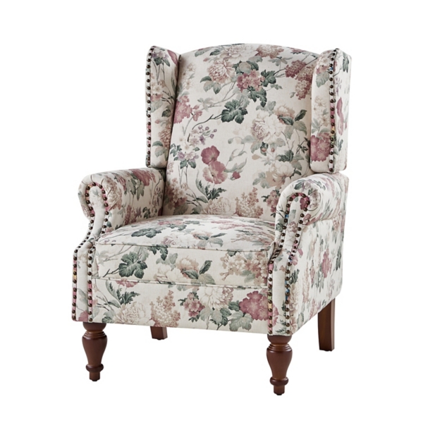 The perfect vintage-look piece to complete your transitional decor, this Floral Theodor Wingback Accent Chair features comfort and durability. With the attractive floral patterned fabric design and spindle legs, it adds a dash of cohesive style. Chair measures 29.5W x 32D x 39.5H in. Crafted with a wood frame and rubberwood legs Upholstered in polyester and filled with high-density foam Brown wood leg finish Features a wingback silhouette Floral fabric pattern Accented with copper nailhead trim Spindle wood legs Hues of pink, green, and white Seat measures 19W x 21D x 19H in. Weight: 46 lbs. Weight capacity: 250 lbs. Assembly required Not intended for commercial use Care: Spot clean. This item is available at Kirklands.com only, not available in stores. Please note: this item cannot be shipped to APO/FPO addresses.
