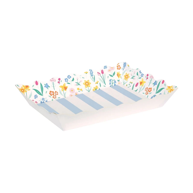 Serve snacks and sweets in springtime style with our Spring Floral Wavy Tray. Featuring soft blue stripes framed by colorful floral illustrations and a charming wavy edge, this paper tray adds an elevated, seasonal touch to Easter celebrations, garden parties, or bridal showers. For more exciting ways to party, shop the rest of our party supplies!