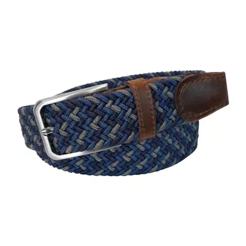 The Myles is a woven elastic 35mm belt. This belt is made with a stretch woven elastic with genuine leather accent tabs. Features a brushed silver buckle with a Florsheim crest logo on the tab this belt can be worn for a casual look.