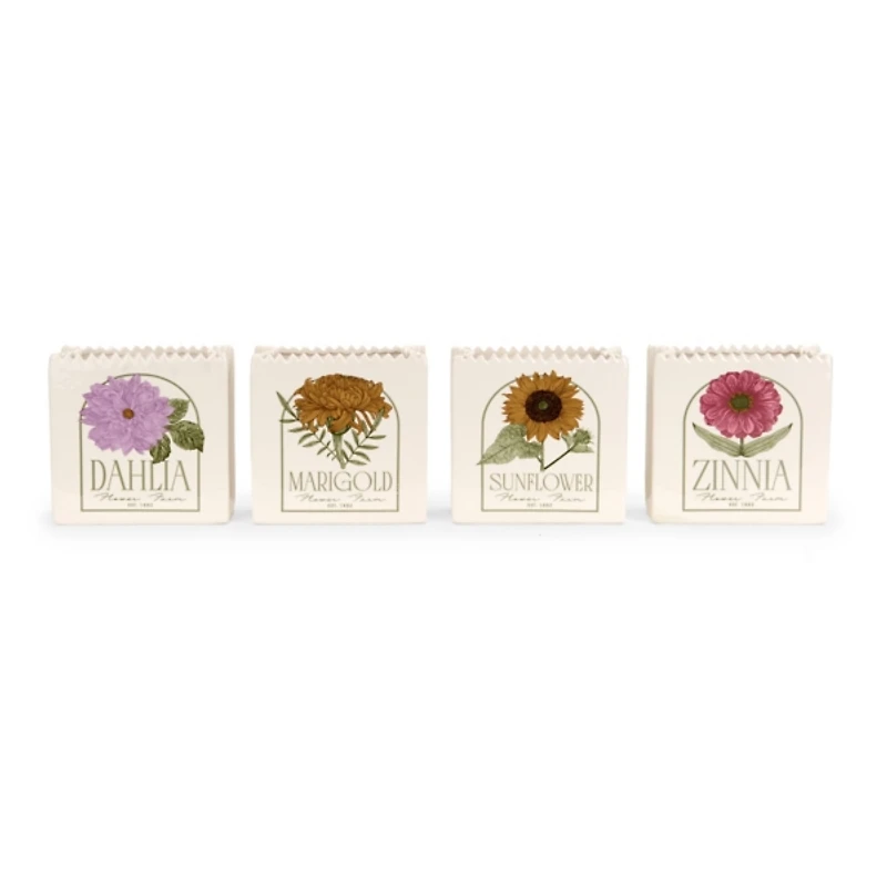 These Flower Seed Packet Outdoor Planters will provide the cutest home for your flowers this spring. Their bright, beautiful designs bring a playful charm to any porch! Sold individually in store Each planter measures 6L x 3W x 6H in. Crafted of dolomite Flower seed packet design Sunflower, dahlia, marigold, and zinnia designs available Hues of white, green, purple, gold, yellow, pink, and brown Outdoor safe Care: Dust with a soft, dry cloth. Contact your local Kirkland's store for availability. Quantities and selection may vary by location.