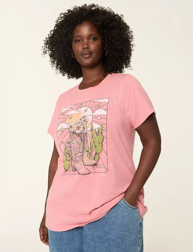 Available in Plus Size This so-soft tee with a cowboy boots graphic makes us want to be at a sunny outdoor concert like, now. FIT: Classic. Designed for curves and a not-too-tight, not-too-loose, just-right fit. Front Body Length From Shoulder: 31" (On Size 18) Longer length is perfect for added coverage. FEATURES: Crew neck Short sleeves Ribbed neckline SPECIAL DETAIL: Shimmery foil graphic FABRIC: Soft, breathable jersey knit Machine Wash 60% Cotton/40% Polyester Item Number #411705 Imported Plus Size Top ". Plus Size Foiled Star & Cowboy Boots Graphic T-Shirt, in Rose, 14/16, Women's, Lane Bryant