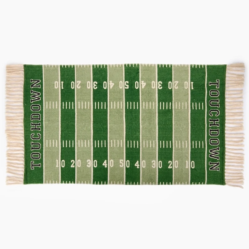 Get ready to cheer on your favorite team from home with this Football Field Scatter Rug. Featuring a fun, playful design, it's a must have for football season! Rug measures 45L x 27H in. Crafted of cotton Football field design Features the word "Touchdown" Hues of green, white, and black Tassel accents Care: Spot clean only. Contact your local Kirkland's store for availability. Quantities and selection may vary by location.