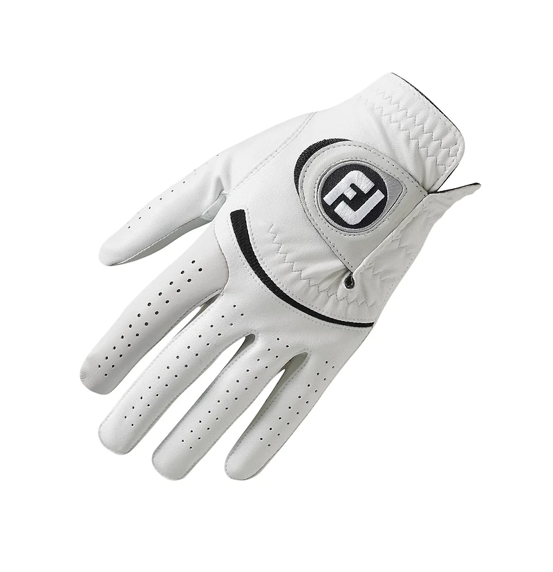 The FootJoy Men's SofJoy Left-hand Golf Glove features a cabretta leather palm for perspiration resistance and PowerNet™ mesh along the fingers and knuckles for breathability. The high-performance FiberSof™ material along the back provides a contoured fit.