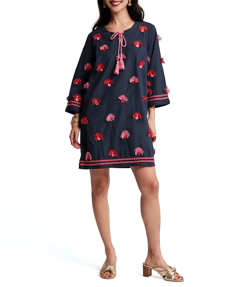 From FRANCES VALENTINE, this dress features: Poplin fabrication Embroidered tassel peacocks Split round neckline Tie neck detail Bracelet sleeves Straight hem with side slits Pullover construction Approx. 35.5" length Cotton Machine wash Imported.