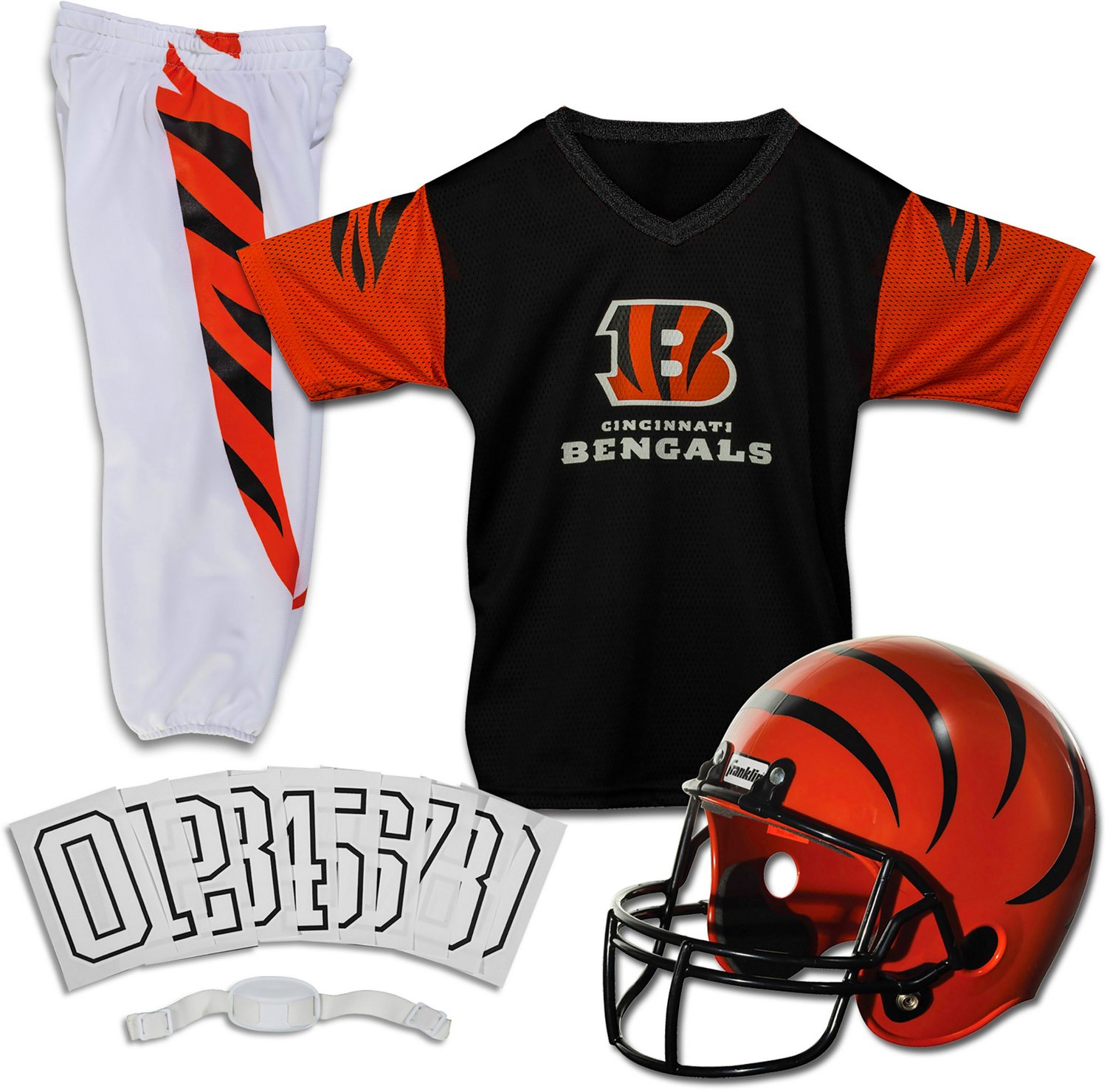 Your child can rep the Bengals in the Franklin Youth Cincinnati Bengals Deluxe Football Uniform Set. This set includes a team jersey, pants, helmet, chin strap and iron-on number kit. The 100% polyester mesh construction provides airflow and durability, while the Bengals team details show your child's team spirit.
