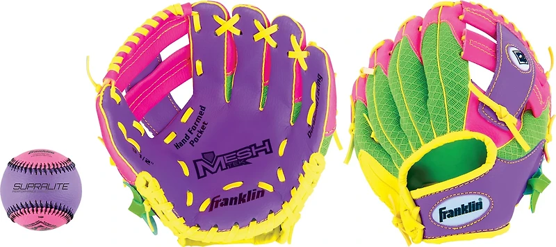 Got a legend in the making? Get them started out right with the Franklin Youth Meshtek 9.5" T-ball Glove with Ball. Perfect for young beginners, this soft and lightweight glove is designed with a mesh construction that makes it easy to handle and comfortable for smaller hands. The hand-formed pocket is shaped to fit naturally, while the soft palm construction means there’s no break-in required—it's game-ready right out of the box. Complete with a soft foam ball, this set has everything your young player needs to start practicing indoors or outdoors. Note: Left Hand Throw = glove worn on right hand to throw with left; Right Hand Throw = glove worn on left hand to throw with right.