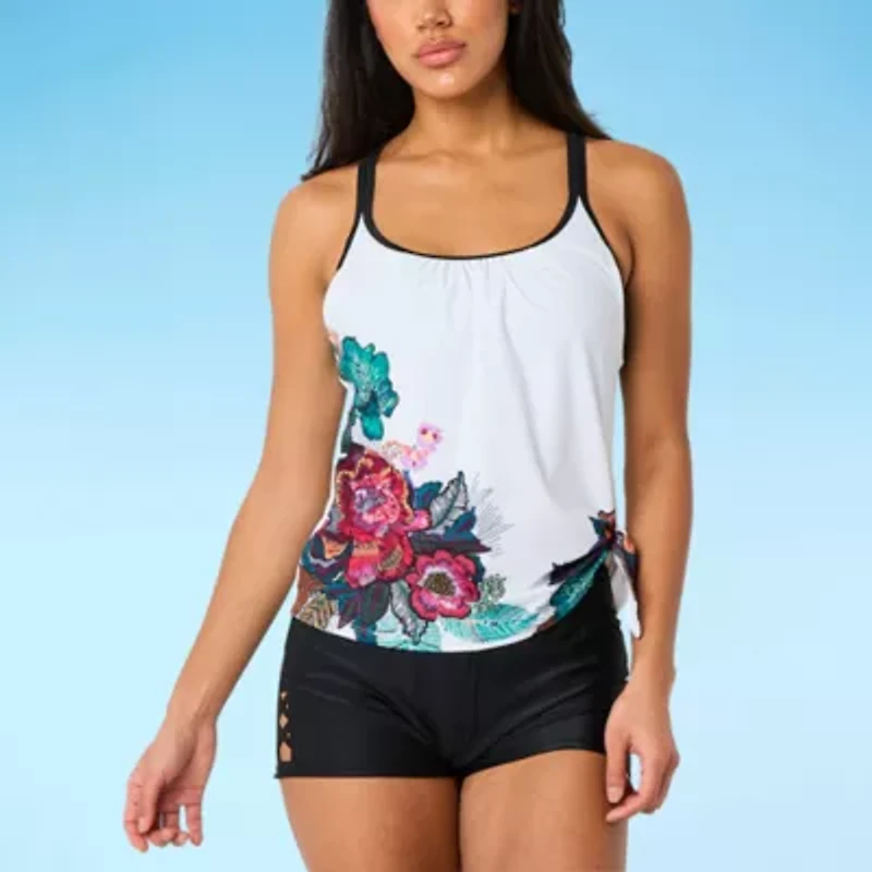 Made from quick-drying stretch fabric, this Free Country women's tankini swimsuit top features an eye-catching floral print. It includes adjustable spaghetti straps that cross at the back, UV protection, a built-in bra, and a side-tie detail. Wear it with your favorite swim bottoms.