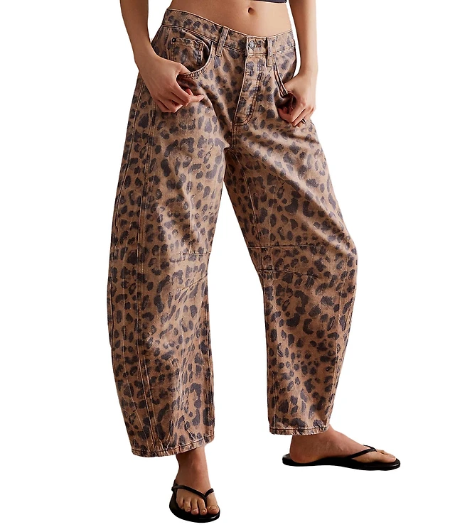 Free People We The Free Good Luck Denim Leopard Print Mid Rise Barrel Jeans