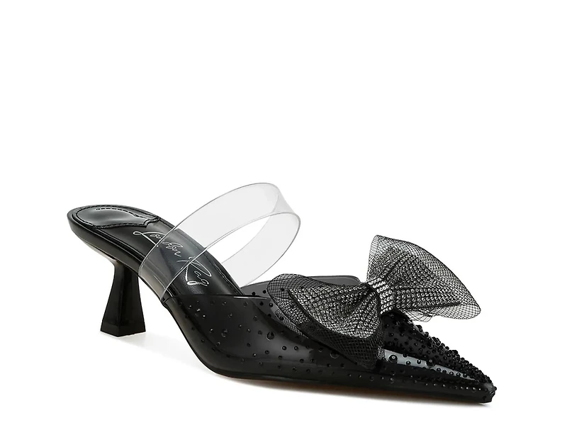Dare to shine in the London Rag Freja mule. This kitten heeled pair sports a sleek lucite design stuck with twinkling rhinestones and a bow detail that catch the eye with each step.
