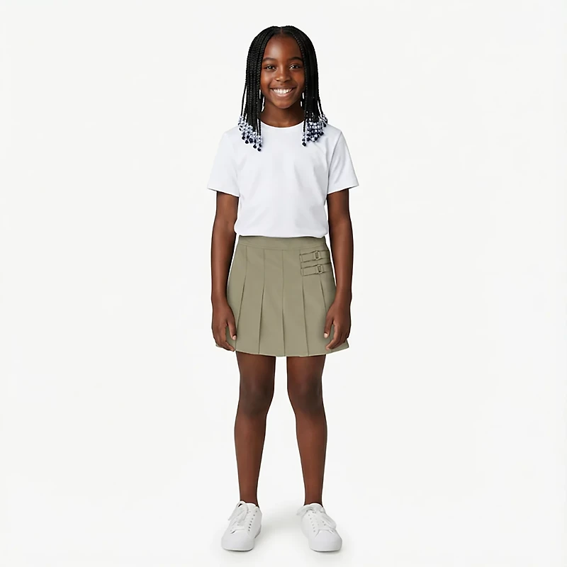 You'll love the classic look of the French Toast Girls' Extended Sizing Two Tab Scooter, and she'll be happy to have a comfy pair of shorts built into the skirt. This scooter is perfect for the active little girl who doesn't want to be held back when it comes time to play. The scooter features a pleated design and has a twin-buckle detail at the waist.