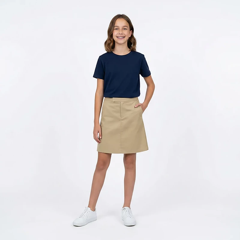 With a below-the-knee style, the French Toast Girls' Kick Pleat Skirt is a great choice for school. This skirt is made of 100% polyester with a tab closure, and elastic at the back provides a comfortable stretch fit.