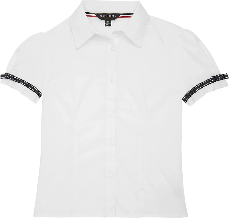 Heading out for a playdate in the neighborhood will be even more exciting with the French Toast Toddler Girls' Ribbon Bow Blouse. This shirt is made with a cotton and polyester blend fabric and features Wrinkle No Moreâ„¢ technology for easy maintenance. It has a button-down collar with short, puffed sleeves. The hems of the sleeves are adorned with ribbons tied into little bows for a girly touch. The tagless design adds to the overall comfort.